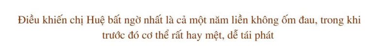 Điều khiến chị Huệ bất ngờ nhất là cả một năm liền không ốm đau, trong khi trước đó cơ thể rất hay mệt, dễ tái phát. Gặp lại, chị lộ rõ sự vui vẻ, tinh thần thoải mái, và không giấu được sự nhẹ nhõm khi nhắc đến quãng thời gian từng bị những cơn đau đầu hành hạ.